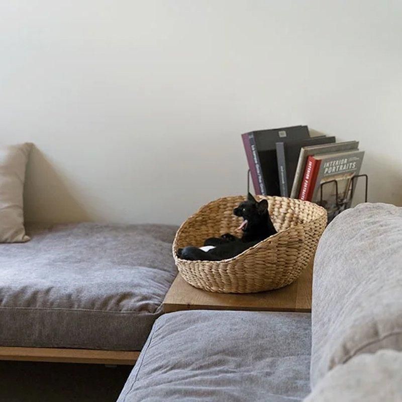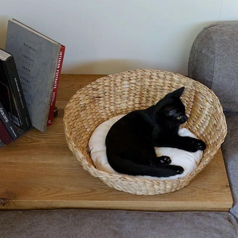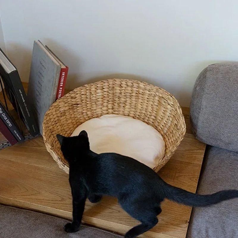 手編みのウォーターヒヤシンスのカゴとクッションがセットになった猫のためのベッドです。
