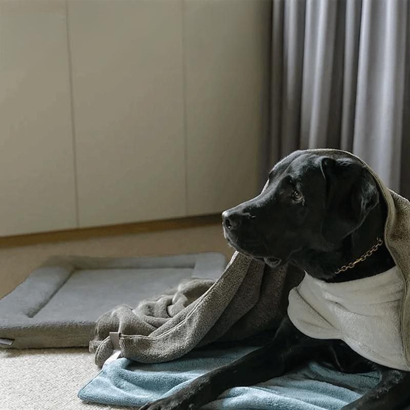 モカとブルー2色のタオル地は、速乾性がありながらとても柔らかい肌ざわりで、犬や猫たちも、思わずゴロンとしちゃう気持ちよさです。