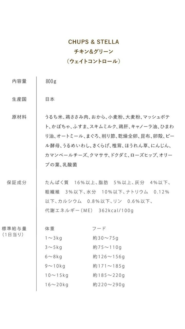 - 標準給与量は、ドライフードのみを与えた場合の目安です。