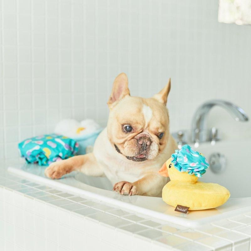ワンちゃんがお風呂に飛びこむ前に、アヒルさんとおそろいのシャワーキャップを被ってみて。