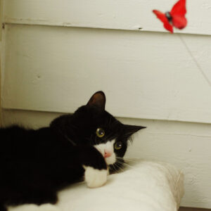動くものにはかまわず飛びつき、追いかけ回したりと、遊び盛りの時期なので、おもちゃを使っておもいっきり遊んであげてください。