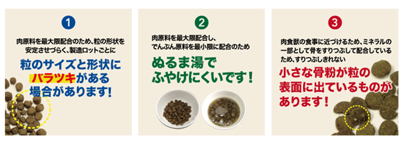 ② デンプン原料を最小限に抑えているため、一般的なドライフードに比べてぬるま湯でふやけにくくなっています。