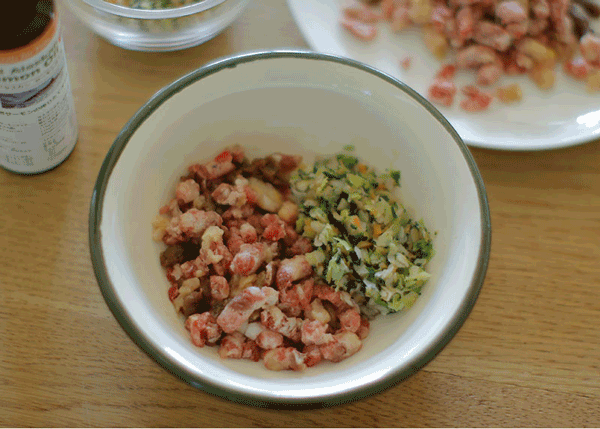 2. 解凍した馬肉、けんこういちばんダイエット、サーモンオイルをよく混ぜ合わせます。